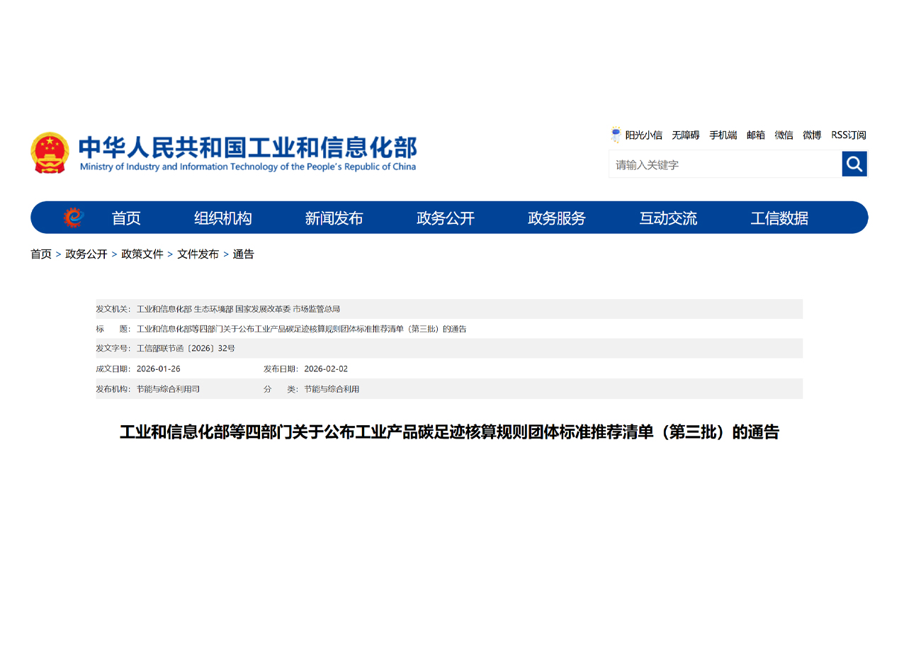 工业和信息化部等四部门关于公布工业产品碳足迹核算规则团体标准推荐清单(第三批)的通告