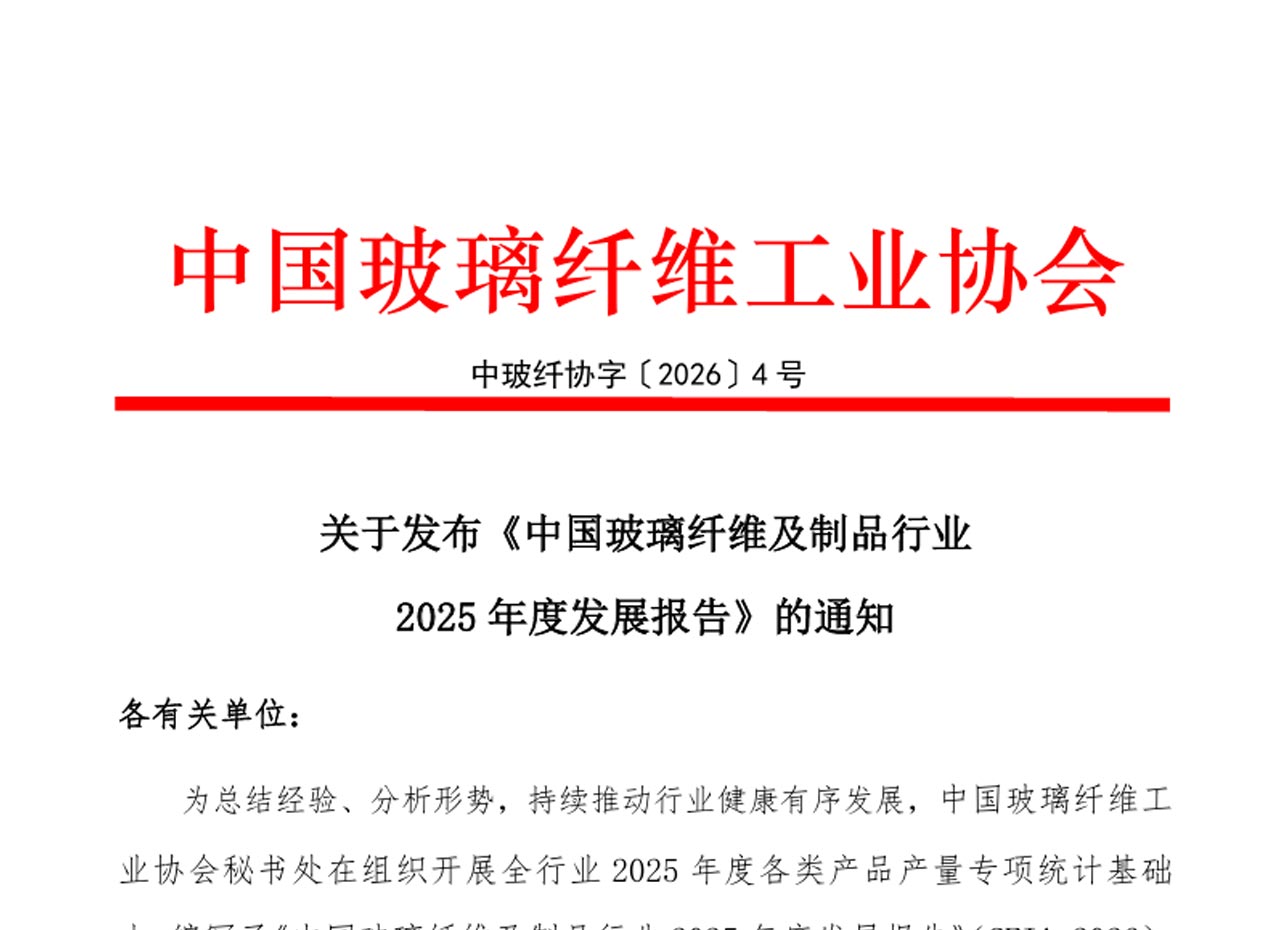 为总结经验、分析形势,持续推动行业健康有序发展,中国玻璃纤维工业协会秘书处在组织开展全行业2025年度各类产品产量专项统计基础上,编写了《中国玻璃纤维及制品行业2025年度发展报告》(CFIA-2026)。现将报告全文正式发布,希望能为参与中国玻璃纤维工业高质量发展建设的有关企业、机构和同仁提供有益的参考和帮助。