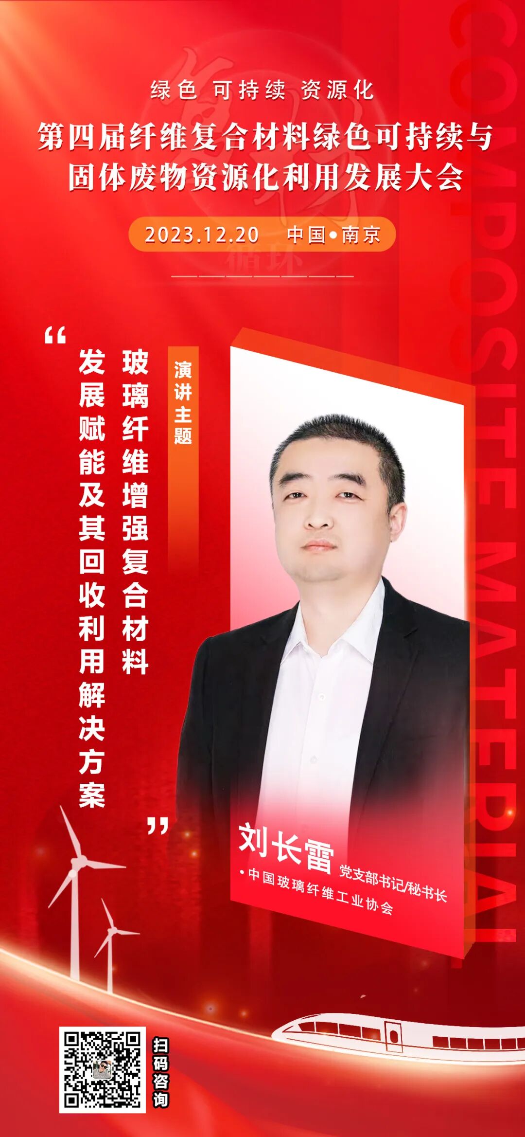 特约嘉宾: 刘长雷 高级工程师 中国玻璃纤维工业协会 党支部书记/秘书长 《玻璃纤维增强复合材料发展赋能及其回收利用解决方案》 大会参与人员 大会• 亮点一览 研讨成立“风电叶片回收资源化利用产业技术松散联盟”。 风电叶片回收资源化产业布局、商业模式、解决方案、回收技术、高效智能处理装备等内容。 2、光伏用聚氨酯纤维增强复合材料(光伏)边框、支架等回收资源化。 1、生产企业“研发废料”、“边角废料”等固废资源化回收资源化利用。 2、复合材料制品在各个应用领域的退役/报废品回收资源化利用。 以区域玻璃钢产业研究为基础,建立适用于中小企业清洁生产方式,从源头减少污染,实现增产增效不增污。 更多亮点持续更新中~ 大会组织机构 丰诺(江苏)环保科技有限公司 中国建材报、中国县域经济报、复材应用技术网、纤维复材再生网、中国风电新闻网、人民网、新华网、今日头条 参会/合作联系 扫码咨询~《风电叶片等复合材料固体废物回收资源化利用行业发展报告(2022)》/本