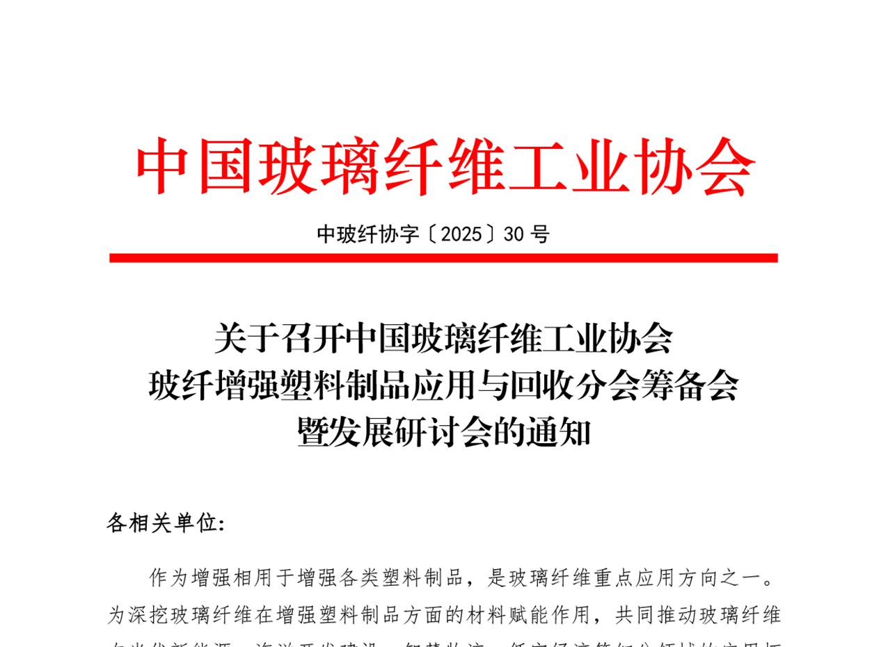 作为增强相用于增强各类塑料制品,是玻璃纤维重点应用方向之一。为深挖玻璃纤维在增强塑料制品方面的材料赋能作用,共同推动玻璃纤维在光伏新能源、海洋开发建设、智慧物流、低空经济等细分领域的应用拓展,同时协同解决各类玻纤增强塑料制品回收再利用问题,助力玻璃纤维及制品行业由高速发展迈向高质量发展,定于12月24日在山东省泰安市召开中国玻璃纤维工业协会玻纤增强塑料制品应用与回收分会筹备会暨发展研讨会。