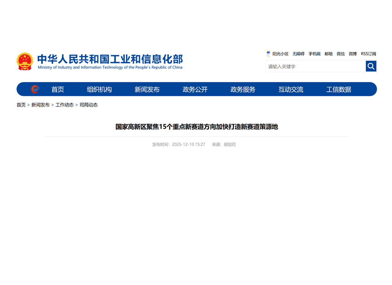 今年年初,工业和信息化部印发了《国家高新区新赛道培育行动方案》(工信厅规函〔2025〕8号,以下简称《行动方案》),明确了推进国家高新区新赛道培育的总体要求、重点方向、培育路径,建立“开放式发现—高标准选拔—精准性培育”机制。根据《行动方案》,工业和信息化部组织开展了2025年国家高新区新赛道培育工作。面向所有国家高新区,组织省级主管部门按年度推荐符合条件的新赛道,搭建了新赛道培育库。坚持自上而下和自下而上相结合,聚焦国家重大战略需求,把握新一轮科技革命和产业变革前沿方向,立足国家高新区发展实际,提出量子科技、脑机接口、具身智能、人工智能大模型、高性能集成电路、第六代移动通信、工业互联网、基础软件与工业软件、清洁氢、高端新材料、商业航天、低空经济、生物制造、细胞与基因、高端医疗器械等15个重点新赛道方向。根据领先性、成长性、带动性等标准,优选出了一批产业基础好、发展潜力大、示范引领作用突出的国家高新区作为新赛道培育的重点园区,更好发挥示范带动作用,促进新赛道加速成长。